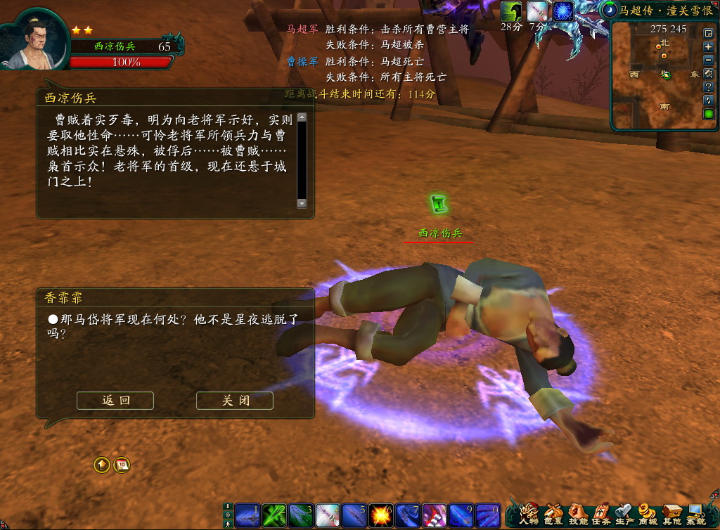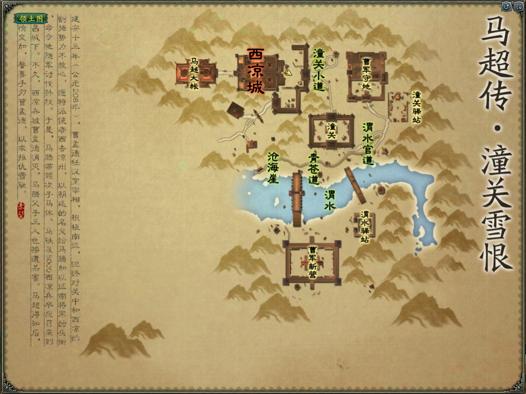 玩家扮演马超军,帮助马超报杀父之仇!进入战场后,会出现庞德将军,玩家可在庞德处接到 任务:最后的生机
