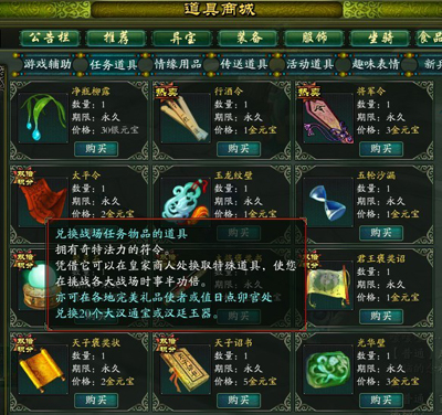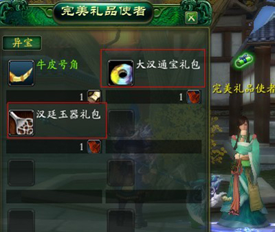 到各地“完美礼品使者”或“值日点卯官处”,通过出售服务,购买大汉通宝包或汉廷玉器包。