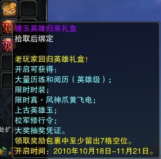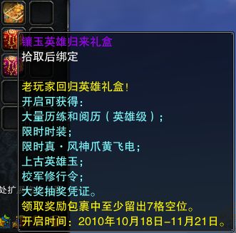 礼盒内含:巨量历练和阅历,助您光速升级;附送精美时装,体验赤壁古装风情;礼盒内含7.0极速坐骑,挑战速度极限!更有上古英雄宝物馈赠回归英雄,可是自身能力大幅提升!还有机会获得抽元宝大奖和高级秘文罐!