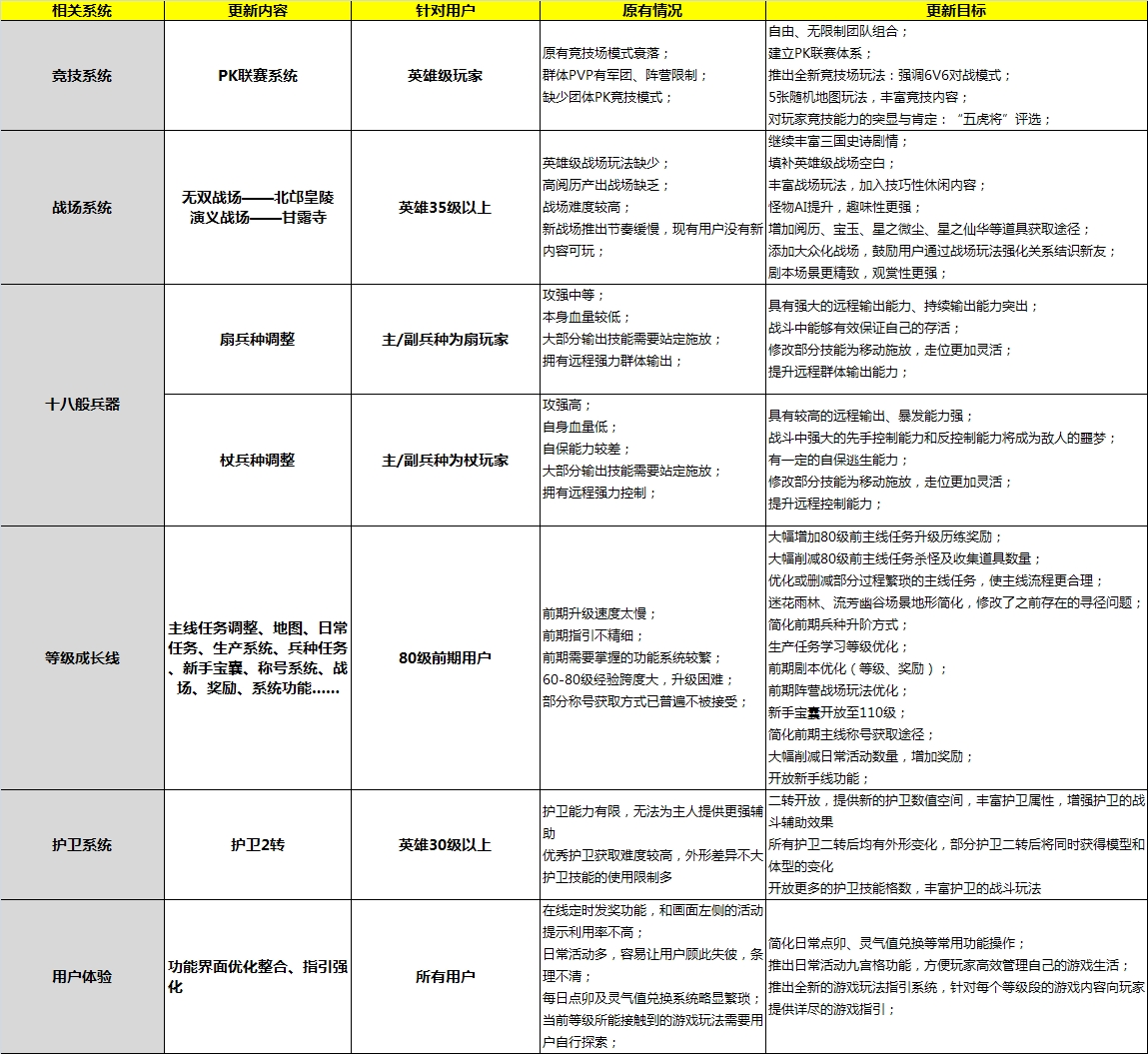 下面我简单的总结一下:七项更新有针对PVP的,也有照顾到PVE的玩家,还有对现有护卫、战魂、日常、成长线的系统性调整,几个整体的方向已经逐一的展示在大家面前了,对于详细内容,将会在下一期的期刊中,由该项功能的主策划人来为大家系统性的讲解。