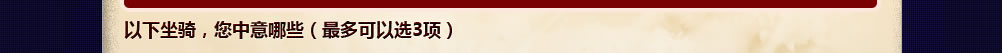 《口袋西游》“抽抽”的物品调查问卷自开放以来,受到了众多玩家的热情关注。通过问卷调查统计,玩家对新坐骑的期待度很高。为了更好地服务玩家,官方特推出八种坐骑供玩家投票选择,看看大家最爱的坐骑都是哪一个吧!说不定,它就会出现在这次的“抽抽”当中!(注:每人最多可以投3票)