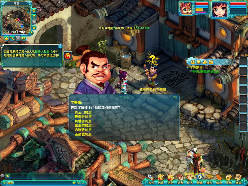 便捷的天书寻径。每一步任务接受之后,系统自动弹出天书界面,只用点击天书界面上的交任务NPC,就可以自动寻径过去了。