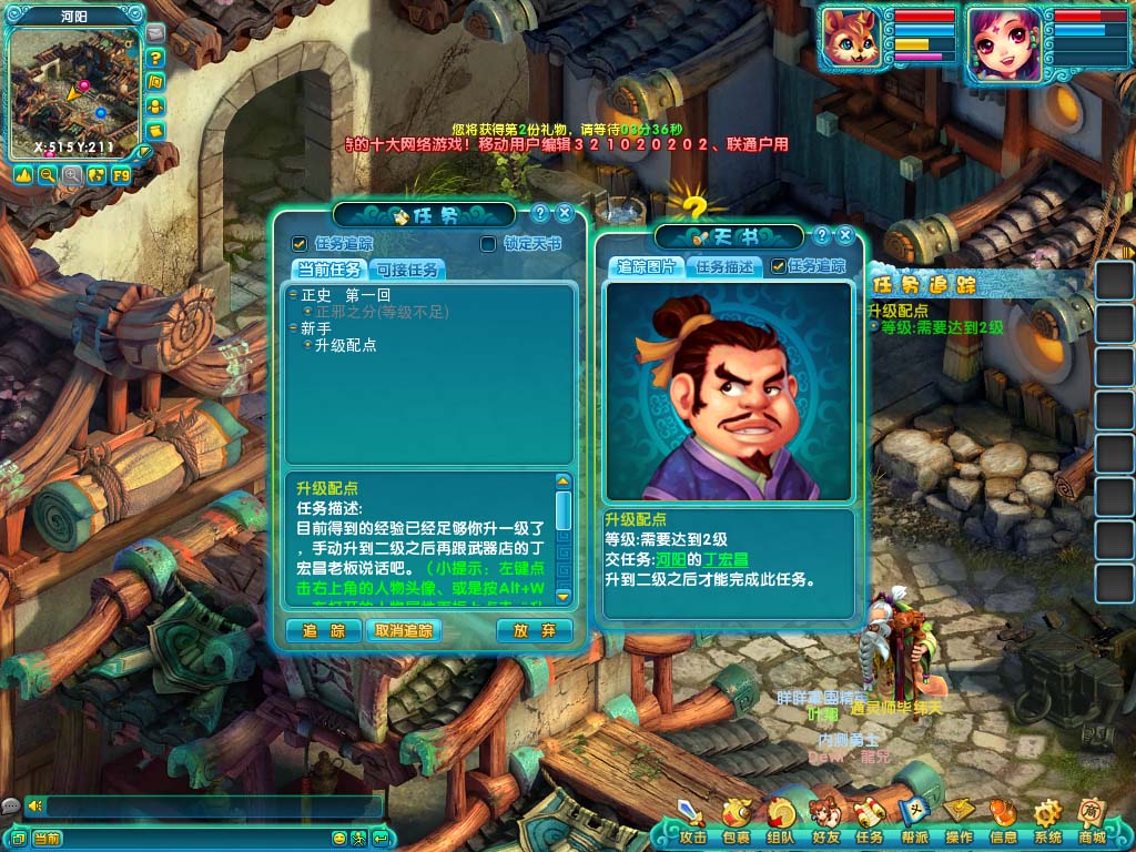 走到NPC旁边,将鼠标停留在NPC身上,点一下左键即可与其对话。看到头上带黄色感叹号的NPC说明他身上是有任务可以接的,而带黄色问号的则是有已经完成的任务可以提交,灰色的问号代表该NPC有已经接受但还没有完成的任务。