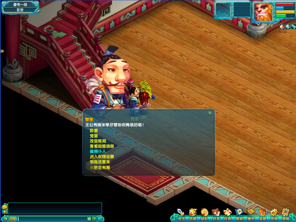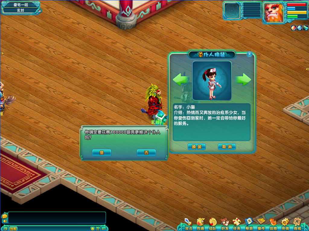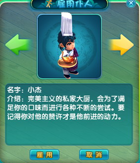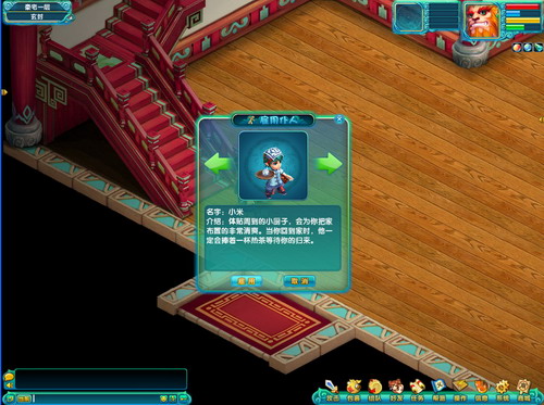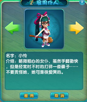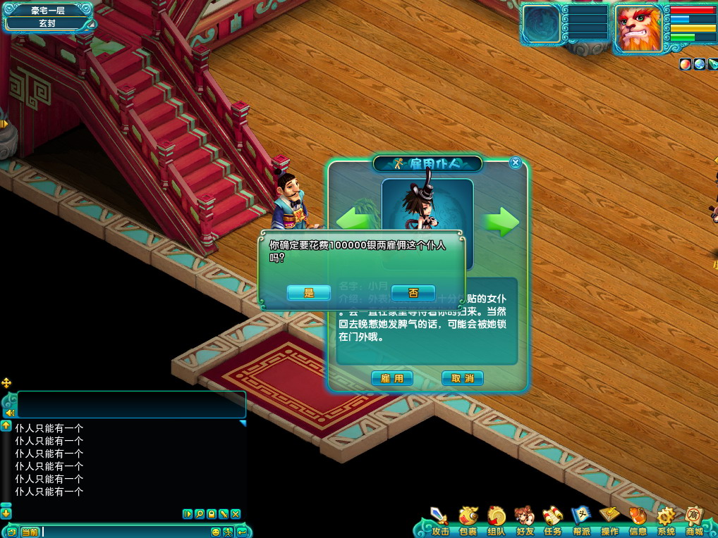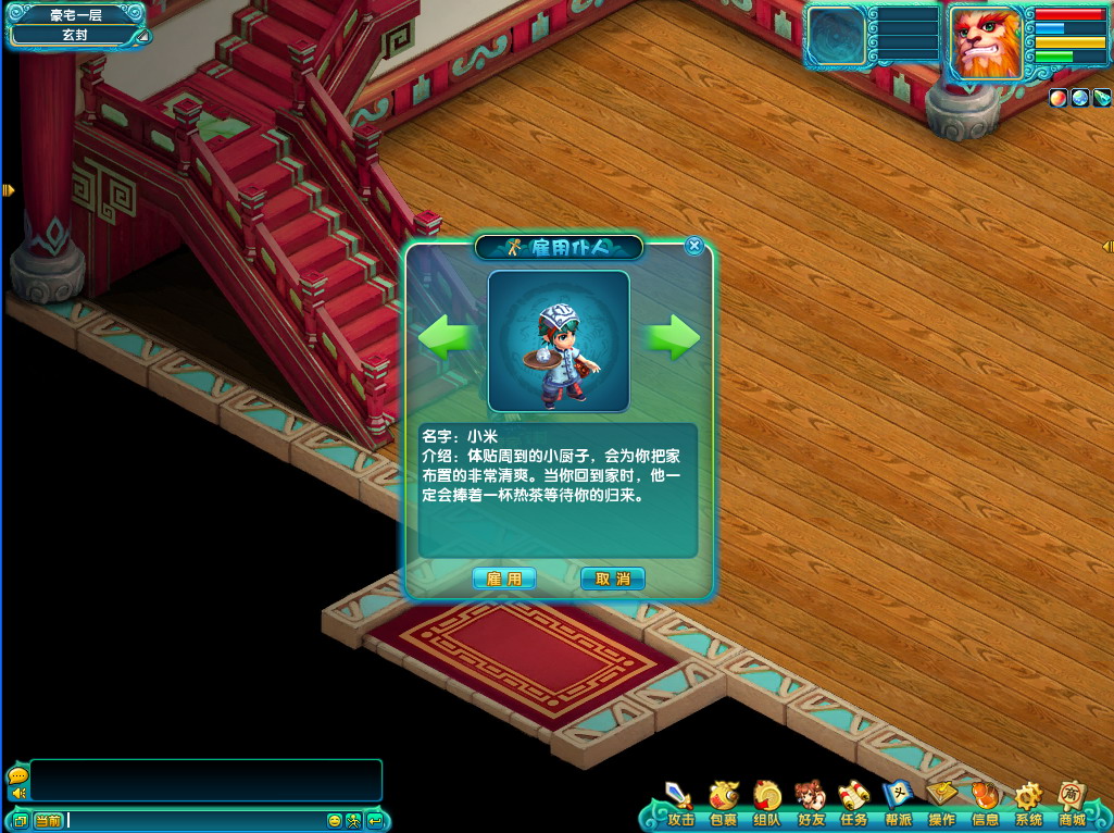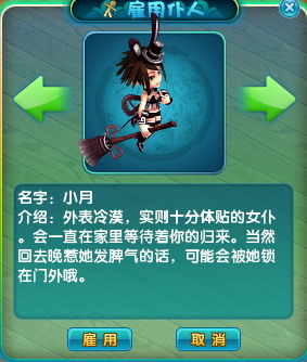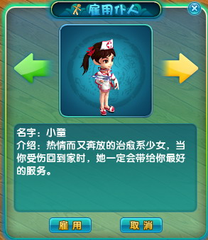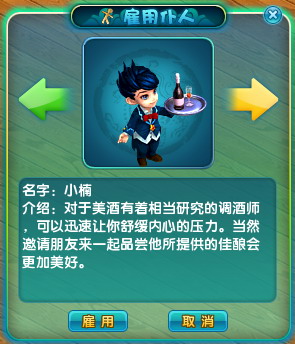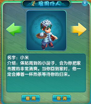 1. 玩家可以在房间的管家处雇佣仆人,点击雇佣按钮会有提示询问是否,雇佣仆人会消耗10万游戏币。