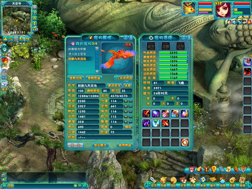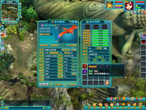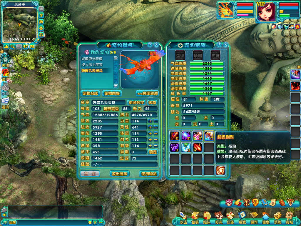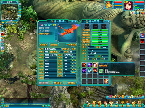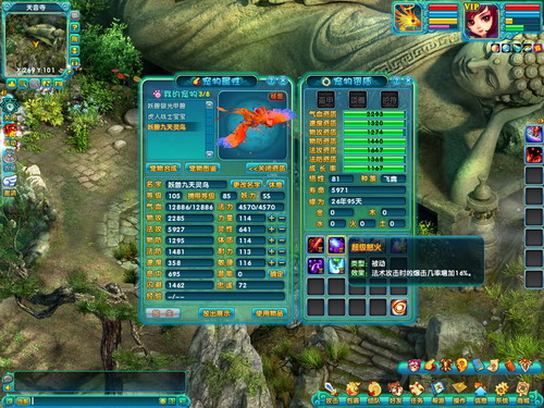 九天灵鸟一直是法系的领军宠物,一身飘逸的羽毛以及高绝的法术资质,受到了所有玩家的喜爱。在配备了超级法伤、超级怒火和超级剧烈后,宠物的法系伤害力已经达到了极致。