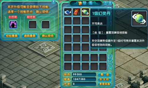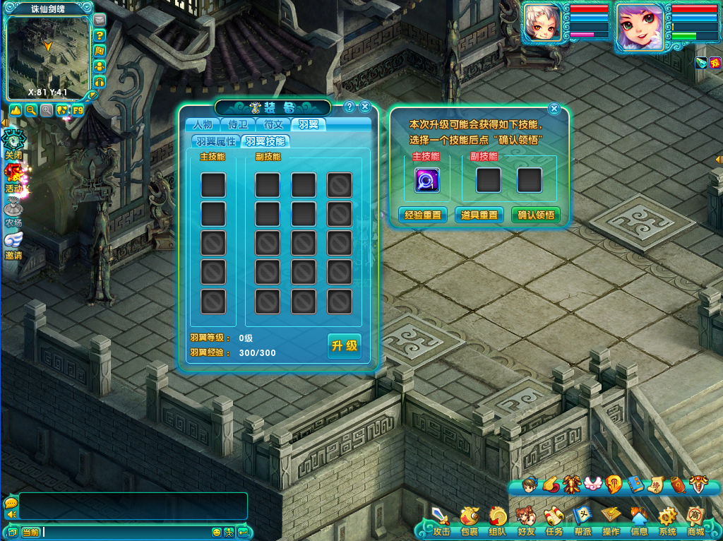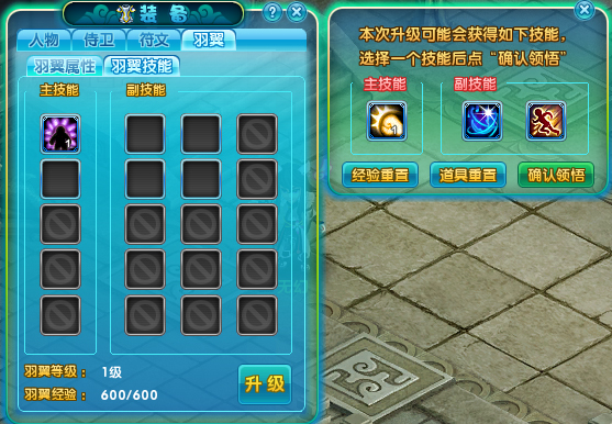 1.每当翅膀满级后点击升级都会出现可以领悟的技能,同时翅膀技能分为主技能和副技能,先从主技能开始领悟。