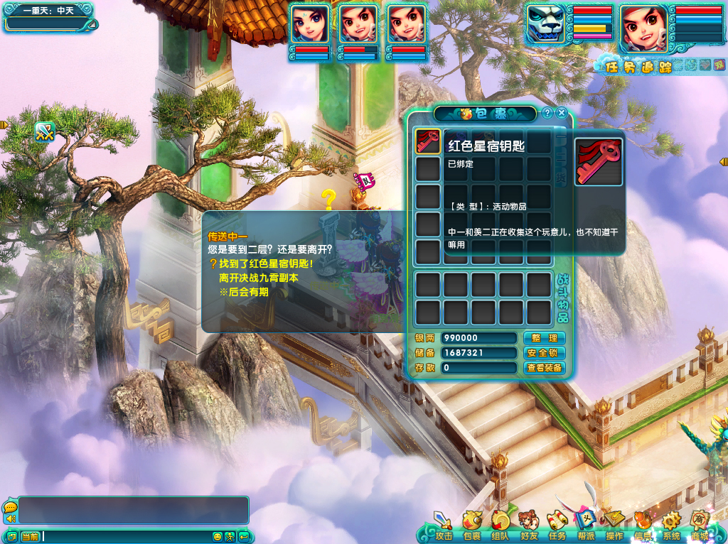 在玩家击败每层的首领后会得到星宿钥匙,镇守在九霄之地最后三层的首领需要所有的修真者交付钥匙到一定数量时才可以开启。