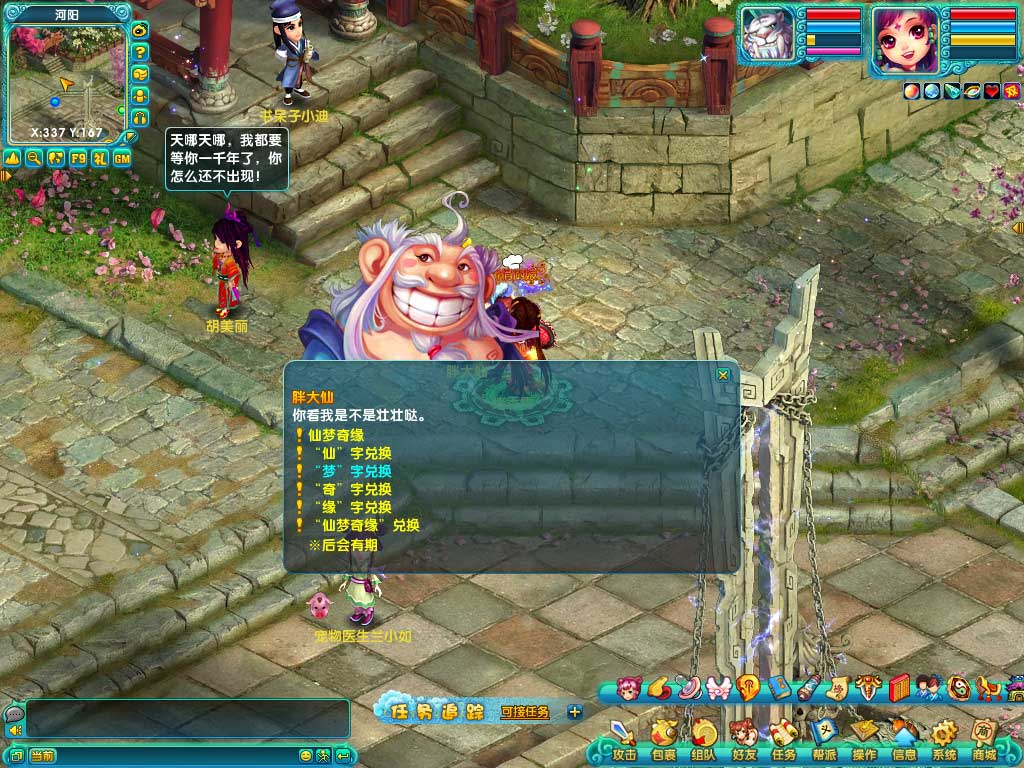 3、当完成了胖大仙的任务后,你将有几率获得【仙梦奇缘】四个字其中一个。在你拥有了这个之后,可以找胖大仙再兑换一个奖励。另外,如果你收集到了一套【仙梦奇缘】,也可以找胖大仙兑换更大的奖励。