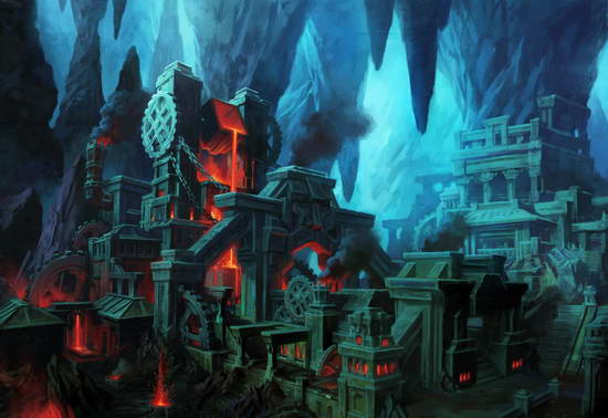 他们身处俯瞰整个洞窟的天然岩架之上,这里大概有魔索布莱所在洞窟的三成大小。不知是蕨类还是残存魔法的缘故,现场的亮度足够让他看清这里的大概情形。他们眼前是一汪深潭,漆黑潭水中立着巨大的钟乳岩。充当哨卡和货铺的长廊楼阁就在钟乳岩上依势而建。天花板也倒垂着石笋,而贾拉索则发现那上面也有类似建筑,显然曾在这里施工的矮人们采用了与卓尔类似的建造思路,并利用了天然的地质条件。贾拉索以前从没听说过这种矮人建筑案例,不过他不认为自己会搞错这些建筑的用途。处理钟乳岩与石笋的工艺手
