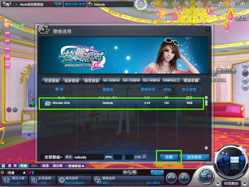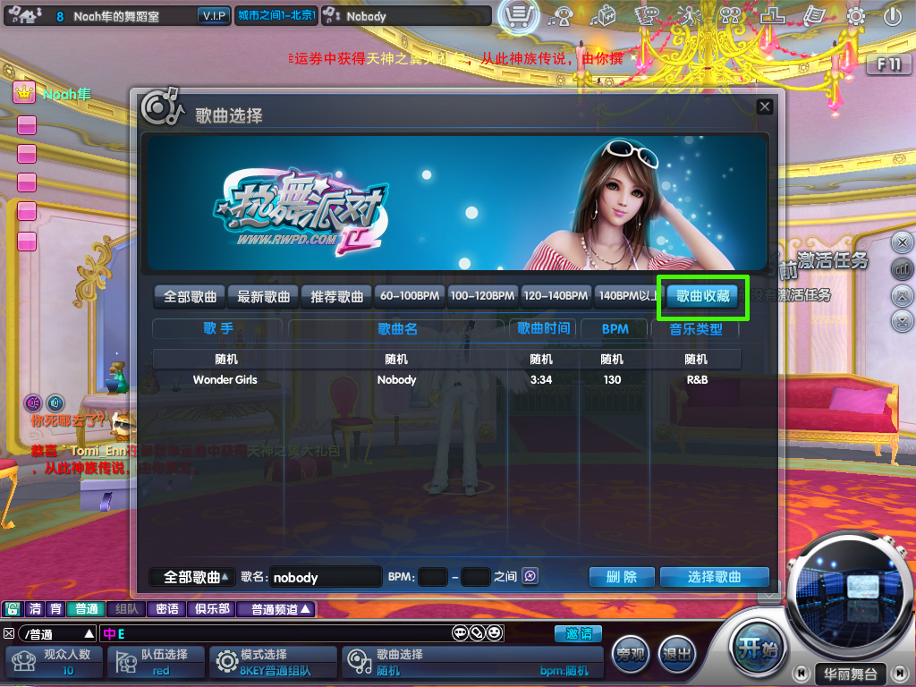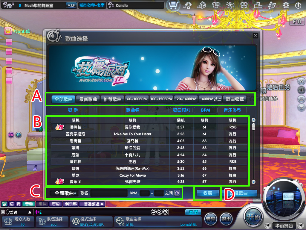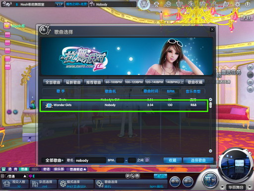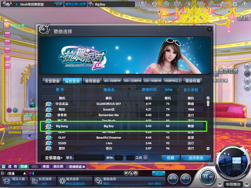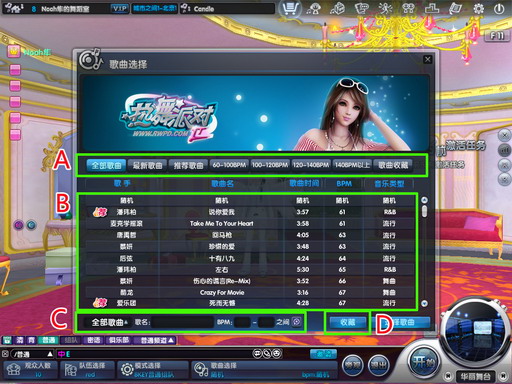 (2) 在弹出的点歌框中浏览并试听歌曲。玩家可根据歌曲速度、最新歌曲和推荐歌曲等分类来进行选择。 在练习频道,玩家只能选择速度120以下的歌曲;新手和高手频道则能欣赏全部歌曲。