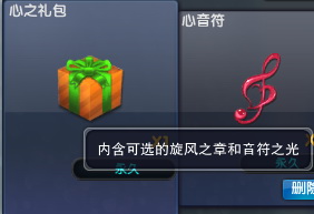 2.心之礼包:内含旋风之章和音符之光,其中旋风之章可以用来制作小旋风哦~!音符之光可以用来制作乐之光芒礼包~!