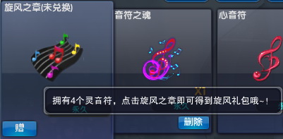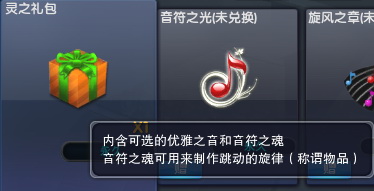 1.灵之礼包:内含优雅之音和音符之魂,其中,当你拥有了小旋风,点击音符之魂就可以将2个音符之魂制作成跳动的旋律,拥有2个跳动的旋律就可以接到称谓任务哦~!