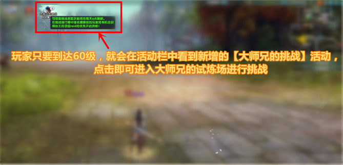 大师兄的挑战玩家达到60级后,在野外场景点击左上方活动栏的“大师兄的挑战”活动图标即可进入试剑崖试炼场场景进行挑战。