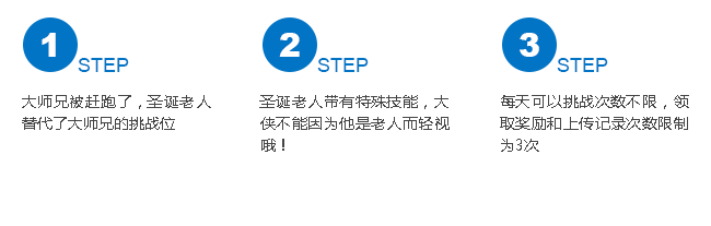 圣诞老人想体验一把被人挑战的感觉,所以把大师兄轰跑,自己创立了个【圣诞老人的挑战】活动,并带有特殊的技能哦!各路大侠还不快来挑战!