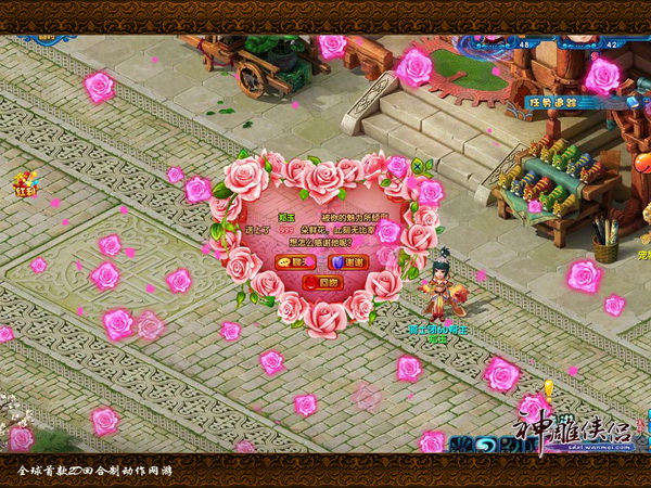 《神雕侠侣》独创的鲜花系统不仅可以让男性玩家全面施展魅力,用大量鲜花获取女性玩家的芳心,更能满足女性玩家爱美的心理。男性玩家向女性玩家送出一定数量的鲜花后,系统会进行全服提示且所有玩家屏幕上都会下起“鲜花雨”,全服玩家都可以跟女主角一起享受鲜花的问候。如果一次性送出鲜花数量达到999朵,下起的花雨会变成浪漫的红玫瑰。