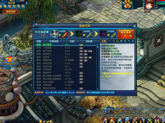 玩家每天上线,和在游戏中完成各种任务、活动就能获得活跃度,当活跃度达到一定数量后,就可以领取活跃度礼包了!最简单的活跃度礼包只要上线就能领取,而且内容相当实用。