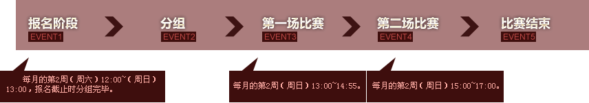 每月的第2周(周日)13:00~13:30之间为第1场比赛的入场时间,15:00~15:30之间为第2场比赛的入场时间。在13:05和15:05时系统都会向已报名玩家发出拉人消息。