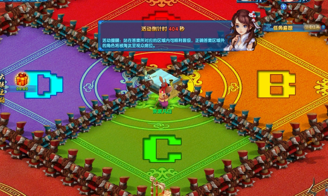 1)每晚19:50玩家可通过系统弹出的活动界面进入答题区域,随机分配至A/B/C/D中的任一区,如下图: