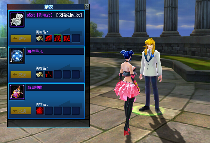 鳞衣的兑换NPC朱利安(潘多拉附近),目前可兑换的鳞衣仅有海魔女一套鳞衣。兑换道具为:金券、黄金圣衣碎片、青铜圣衣碎片及白银圣衣碎片。