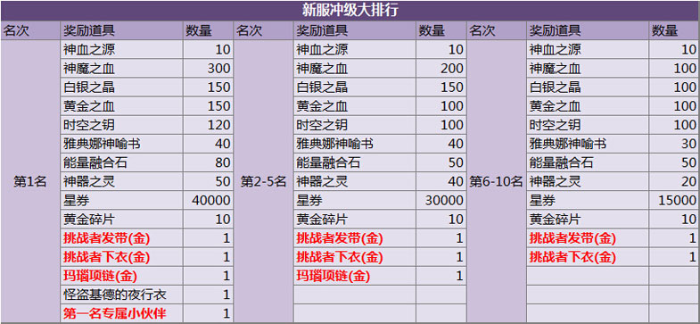 自3月20日全新服务器"凤凰座"开启后,至4月19日23:59,服务器内等级排行前10名的玩家,可获得"极其丰厚"的冲级大礼包1份!游戏内排行榜可能会有延迟现象,最终榜单,将以官网公布为准!