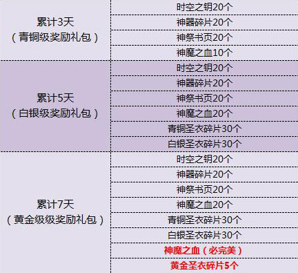 10级橙魂、灵力之源100个、时空之钥100个、必完美1个、蒙面道具14个(每次达到20活跃度可领取一个)