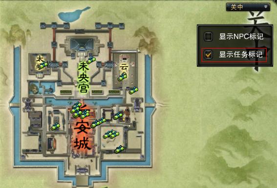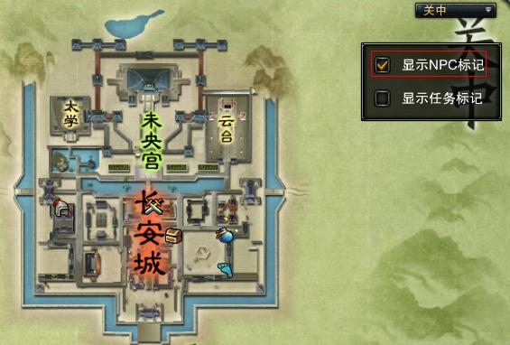 勾选后后,地图上将标出主要NPC及可接任务的位置及图标,鼠标移动到图标后,将提示NPC功能及名称;而任务图标则显示可接任务名称、奖励物品等信息。例如长安,标记出了杂货商,驿站,孙尚香,押镖的位置。在其他地图上,每个驿站NPC也将出现在标记上。