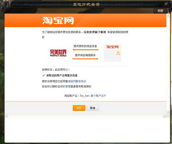 另外增加了淘宝网及人人网登录按钮,玩家可以通过点击相应第三方网站图标,使用已有账号登录游戏。