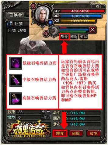 玩家需要确认背包内是否有召唤兽活力药,如没有的话可在亚特兰蒂斯广场找召唤兽药品商人-雷斯(105,197)购买召唤兽活力药,然后在游戏界面下方快捷栏点击【召唤兽】按钮或通过快捷键“X”打开召唤兽界面,点击【喂食】按钮来补充召唤兽的HP和MP。