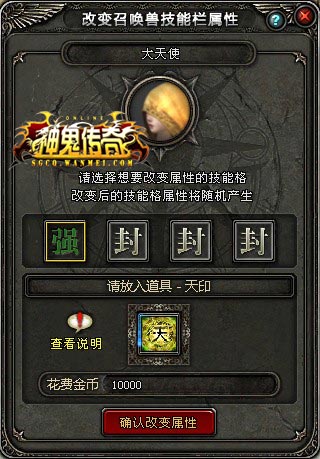 与召唤兽训练师-利格对话后选择【改变召唤兽技能栏属性】按钮即可进入改变技能栏界面,选择要改变技能的召唤兽,并确保身上有“天印”,选择需要改变类型的技能栏,点击改变属性即可完成。