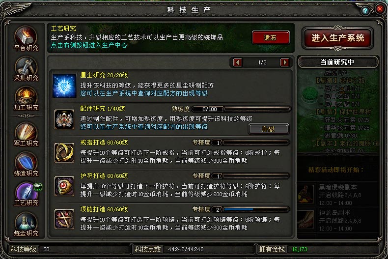 在游戏界面点击或快捷键“D”进入科技生产系统界面,选择喜欢的生产技能进行研究。