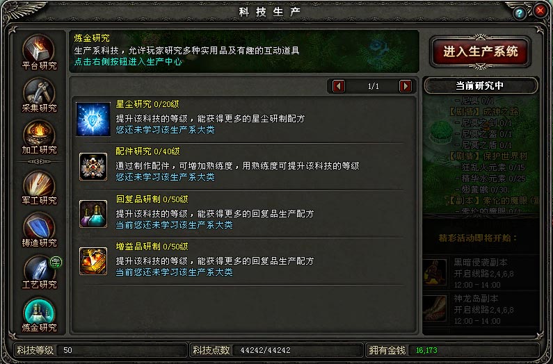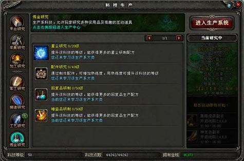 在游戏界面点击或快捷键“D”进入科技生产系统界面,选择喜欢的生产技能进行研究。