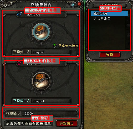2.召唤兽融合需要两位玩家共同完成。两位玩家在召唤兽融合界面中放入满足融合要求(召唤兽等级大于等于30级)的召唤兽后,点击【开始融合】按钮,即可对召唤兽进行融合。