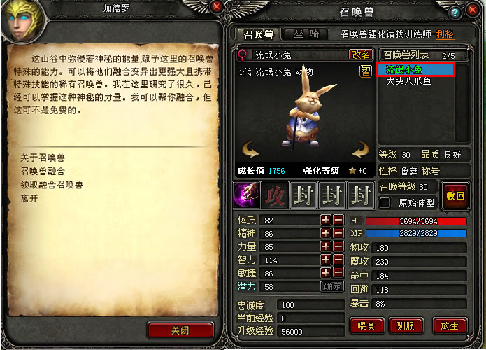 3. 召唤兽融合成功几率为100%,但融合过程需要持续30分钟。融合结束后,进行召唤兽融合的两方玩家都可以从召唤兽融合NPC处领取二代变异召唤兽,且原有的一代召唤兽不会消失。