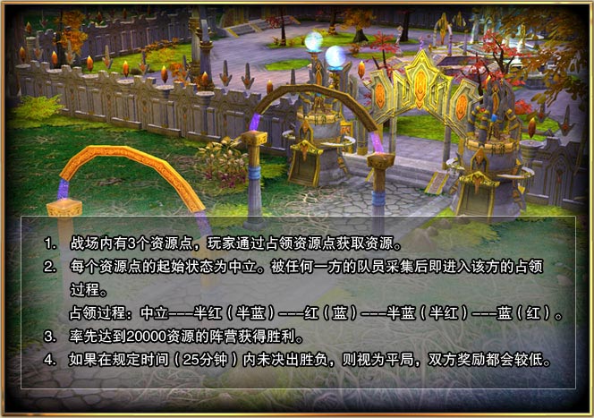 4、当双方阵营平均都超过12个勇士时战场开启。持续25分钟(开启后每个阵营最多可补充到18个勇士从而才无法再有人员进入)。