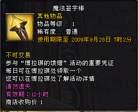 2、“三生石”、“同盟碑”、“情谊结”、“星座卡”(存在12小时)需要玩家签名才能激活。到博拉琪那里领取“签字魔法棒”(存在12小时),点击“三生石”、“同盟碑”、“情谊结”、“星座卡”即可完成签名。签名后会根据道具的不同获得相应任务,签字以后是道具存在时间为3个小时。