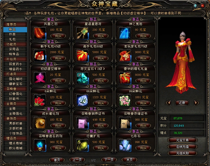 按快捷键【V】键或点击屏幕右上方的【众神宝藏】按钮,即可打开众神宝藏游戏商城。