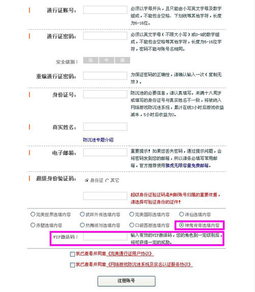 用户通过完美通行证注册《神鬼传奇》账号时(点击注册)需要填写“ 神鬼传奇选填内容”,并在选填内容下方的“VIP激活码”输入卡号,注册完成后,才算成功激活的账号。