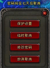 步骤五:临时取消:在设置菜单中点击【临时取消】按钮,会弹出安全密码输入界面,输入安全密码后点击【确定】按钮,临时取消安全保护。账号重新登录后,保护自动恢复。