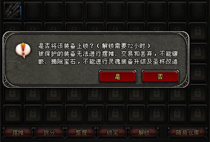步骤一:请把需要锁定的装备从身上取下来放在背包里,点锁定键会出现锁定提示:“是否将该装备上锁?被保护的装备无法进行摆摊、交易和丢弃,不能镶嵌、摘除宝石,不能进行灵魂装备升级及圣杯改造”。