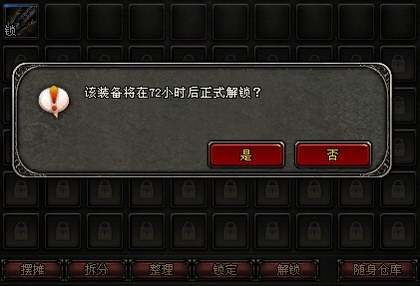 步骤三:如果需要对该物品进行镶嵌或其它等操作,需要点击物品界面中的解锁键,会提示;“该装备将在72小时后正是解锁”只有解锁后的物品才能进行交易、镶嵌、升级等操作。
