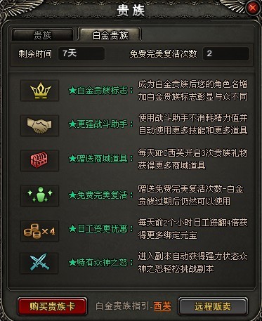 7天白金贵族用户可以免费获得2次完美复活机会;