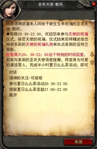 每周六晚20:30—22:00之间和NPC圣衣天使对话,就可以参加【夏日么么茶活动】。