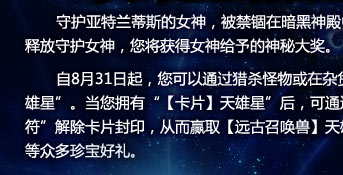 召唤兽 | 封印了的远古召唤兽的蛋,点击使用后将会获得远古召唤兽—天雄星。天雄星为远古圣战中仅存的圣兽之一。 终极技能:幻影之刺——瞬间舞动身后的8根尖刺刺伤目标,对其造成5倍力量、体质、敏捷、精神、智力总和的伤害。并有50%的几率使其在随后的5秒处于重伤状态,受到所有伤害增加10%。 |