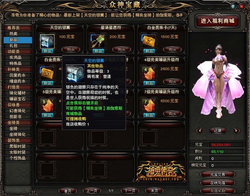 点击【众神宝藏】中【新品】按钮,即可找到“天空的银翼”。