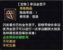 闪烁着光芒的金色签子,能够带给你幸运,使用金签子可以进行一次幸运翻牌大抽奖,内有四级宝石箱、化身能量水晶、巨额钱袋等各种物超所值的道具奖励等你来拿!(注:可以找亚特兰蒂斯的西芙开启贵族礼物)。
