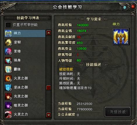 注:学习技能需要消耗人物的经验、金钱、贡献度和公会的公会资金和繁荣度,不满足其中任何一个条件,人物都无法升级公会技能。