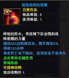 增加350点物理攻击,提升物攻5%,持续120分钟 角色死亡或下线时,该状态也不会消失 |