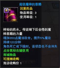 增加350点魔法攻击,提升5%魔攻,持续120分钟 角色死亡或下线时,该状态也不会消失 |
