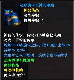 增加8500点魔法上限,提升魔法上限5%,持续120分钟 角色死亡或下线时,该状态也不会消失 |