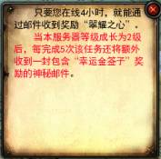注:当本服务器等级成长为2级后,每完成5次该任务还将额外收到一封包含“幸运金签子”奖励的神秘邮件。